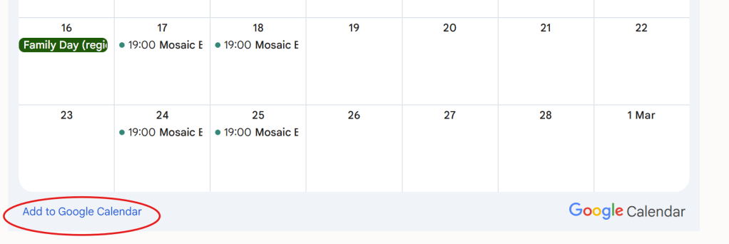 Did you know you can subscribe to our calendar and look months ahead? Venues are booked months in advance, and you too can plan your own badminton adventure. Go to our Calendar page and click on Add to Google Calendar to add Mosaic Badminton dates on your calendar. You will receive reminder alert the day before the event.