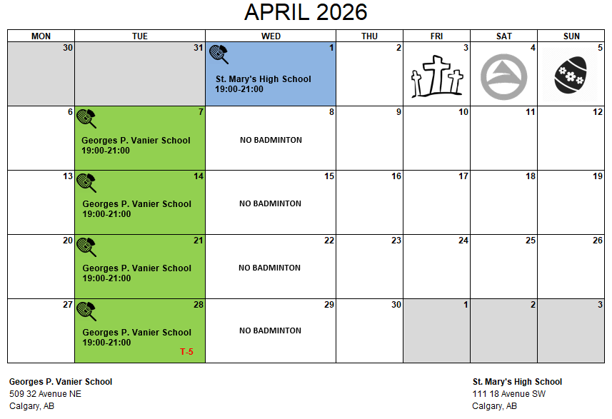As we are approaching the end of the 2025-26 season, this is a friendly reminder that all prepaid and complimentary passes expire after the last session in May. To help you plan your badminton adventure in the next couple of months, we now indicate the number of remaining sessions on our monthly calendar graphic. For example on April 28, there remains 5 sessions including that date. As always, all our passes are shareable and transferable. So take this great opportunity to share the joy of badminton with your friends and family.